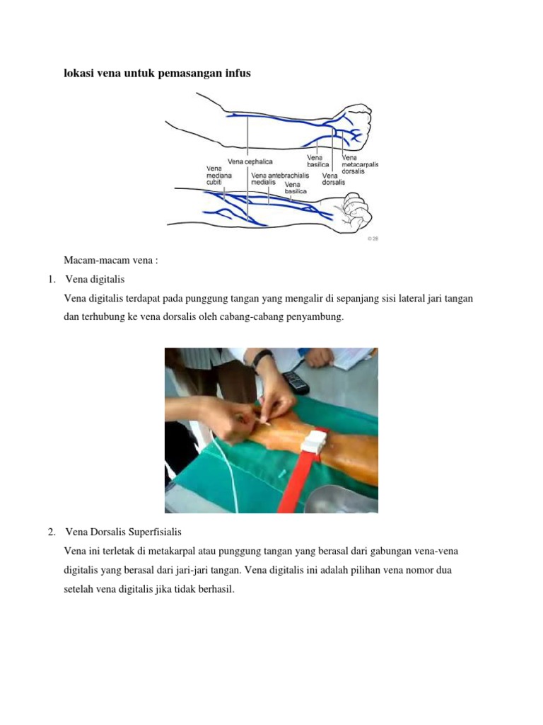 Maka dari itu Anda perlu lebih berhati-hati agar selang infus tidak terlepas saat Anda tidur berjalan atau melakukan aktivitas lain. Vena digitalis ini adalah pilihan vena nomor dua setelah vena digitalis jika tidak berhasil.
